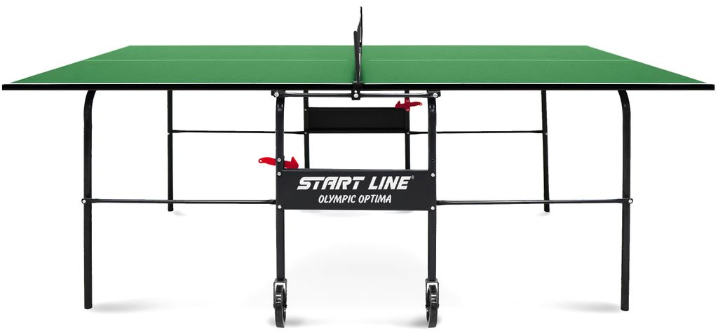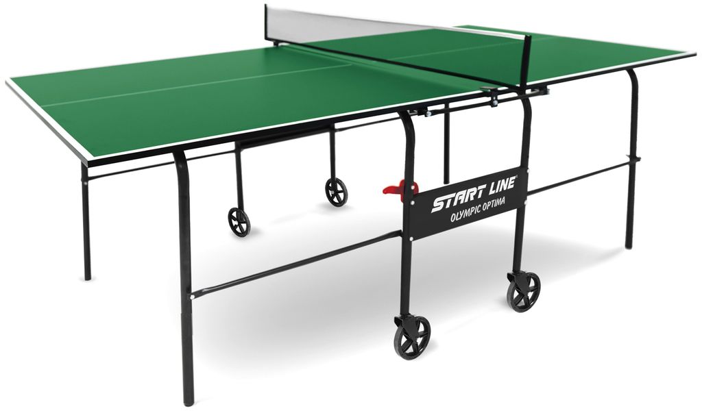 Start Line Olympic Optima привлекателен своим компактным размером, поэтому станет незаменим для установки в небольшом помещении. Его длина и ширина меньше стандартной, неизменной остается только высота в 76 см. Конструкцией предусмотрена возможность одиночной игры. Удобная компактная система сложения, легко складывается и раскладывается. Модель маневренная, оборудована встроенной сеткой, не требующей демонтажа при складывании. Start Line Olympic Optima предназначен для игры не только взрослых, но и детей. Габариты модели требуют минимального места при игре и обеспечивают удобное хранение стола между играми.